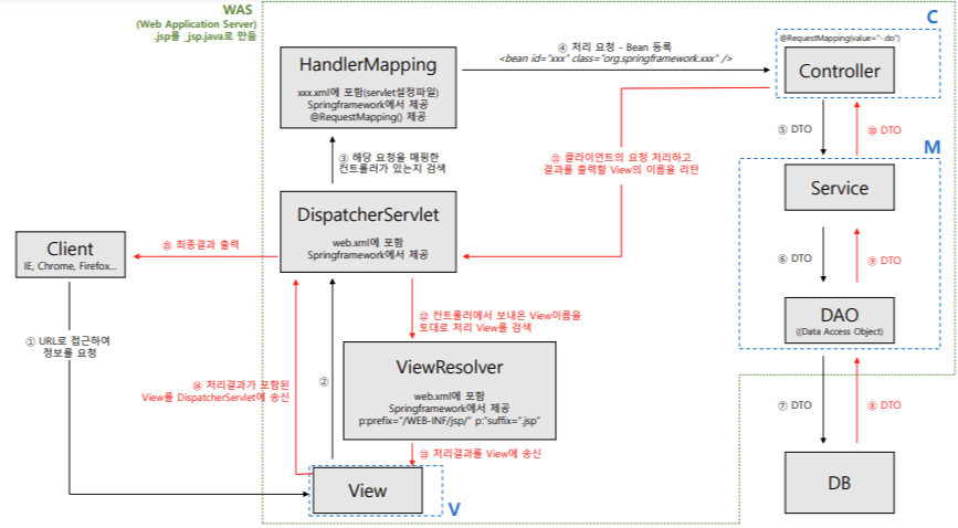 - View : 처리 결과를 포함한 view를 DispatcherServlet에 송신